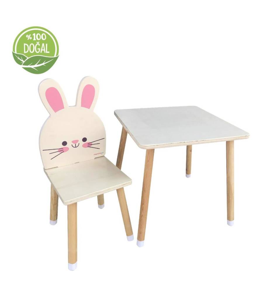 Doğal Ahşap Çocuk Aktivite Masa ve Sandalye Takımı - Tavşan, çocukların yaratıcılığını geliştirmek ve eğlenirken öğrenmelerini sağlamak için özel olarak tasarlanmıştır. Sevimli tavşan temasıyla odalara neşe katıyor.