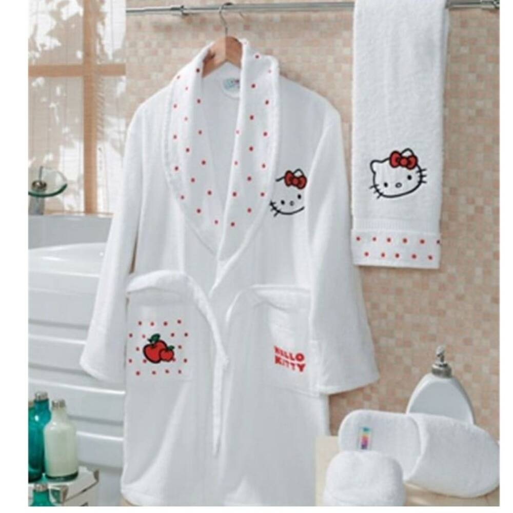 Dayanıklı ve Kolay Temizlik: Yüksek kaliteli pamuk kumaşı sayesinde, Hello Kitty Beyaz Bornoz Seti uzun süre dayanıklı olup, yıkama sonrasında da yumuşaklığını korur.