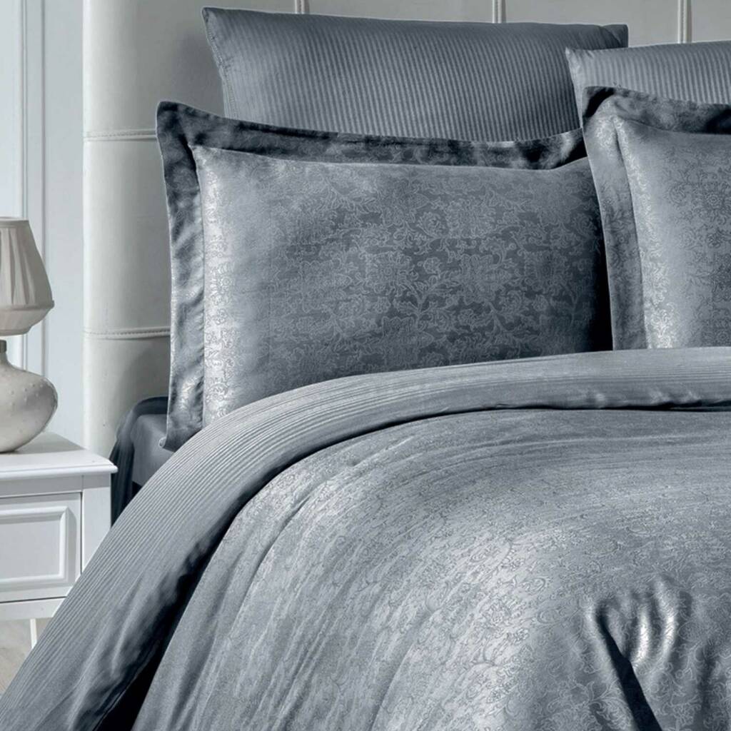 Zarafet ve Konforun Buluştuğu Jakarlı Saten Reyka Antrasit Çift Kişilik Nevresim Takımı