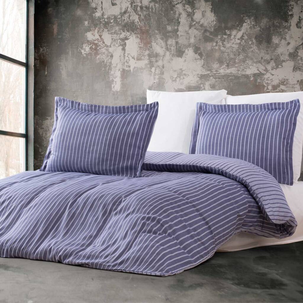 Bambu Çizgili Lacivert Tek Kişilik Nevresim Takımı, doğal ve sağlıklı bir uyku deneyimi sunar. %100 bambu malzemeden üretilmiştir, bu da nefes alabilir, antibakteriyel ve yumuşak bir dokuya sahip olduğu anlamına gelir. Ürün, nevresim, çarşaf ve yastık kılıfı olmak üzere üç parçadan oluşur. Lacivert renk ve çizgili deseniyle şık bir görünüm sağlar.