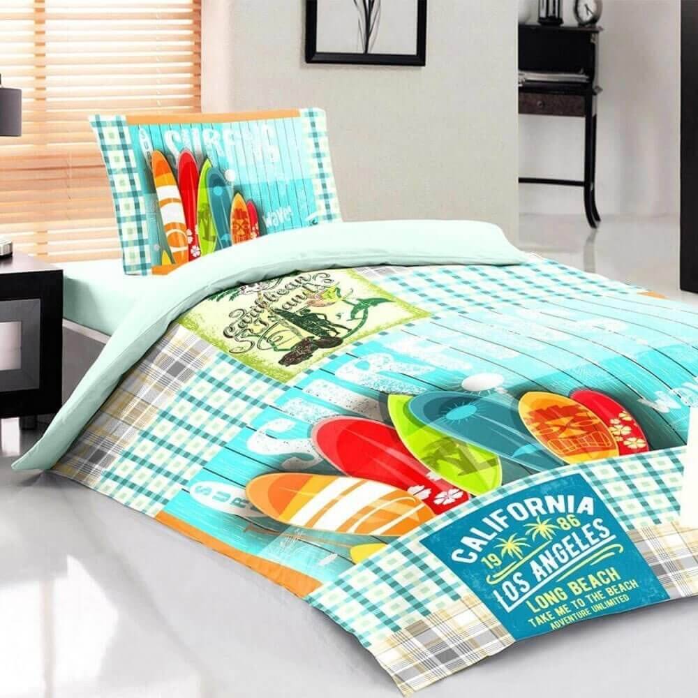 Mavi ve beyaz tonlarındaki sörf temalı dijital baskılar, gençlerin deniz ve sörf tutkusunu yansıtarak odalarına enerji ve hareketlilik katıyor. Battaniye ve yastık kılıflarıyla tam bir set oluşturan bu nevresim takımı, gençlerin odalarını eğlenceli bir atmosfere dönüştürür.
